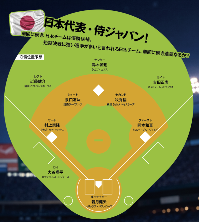 1番には出塁が期待できる近藤選手を置き、2番大谷選手、3番鈴木選手、4番吉田選手と、MLBで活躍する選手を中心に据えると予想。やはり大谷選手、鈴木選手が打線のキーマンになるでしょう。5番・6番には今季MLBに移籍する村上宗隆選手、岡本和真選手が続くのではないでしょうか。キャッチャーはオリックスで山本投手とバッテリーを組んでいた若月選手がレギュラーになるのではと予想しています。キャッチャーを一人に固定するか併用にするのかは、予想が難しいところです。