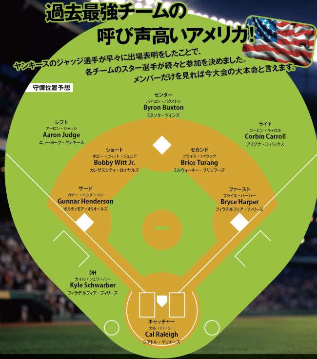 MLBに所属する選手は、大会スタート当初は出場に消極的な選手も多かったのですが、近年は積極的になっており、より各国の「真剣勝負」の意識が強くなってきています。今大会も、アメリカチームをはじめとする各国からMLBの主力選手が出場を表明し、大会開始前から盛り上がりを見せています。