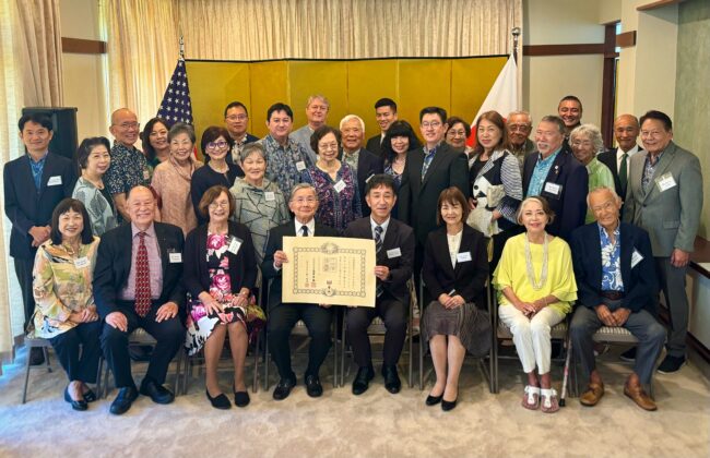 伝達式で長徳総領事は、受章への祝辞を述べた上で、日本とハワイ、さらには日本と米国との間の友好親善の促進に対するコバヤシ氏の多大な貢献、特に、福岡県との姉妹州交流におけるコバヤシ氏のリーダーシップ、ならびに重層的な交流の推進と日米両国間の相互理解および信頼関係の強化に果たされた役割に深い敬意を伝達しました。コバヤシ氏は、ハワイ福岡県人会、ハワイ州議会、ならびにハワイ州姉妹州プログラムにおける活動を通じて日米関係の発展に尽力してきたこと、とりわけ福岡県との姉妹州関係の強化や草の根交流の推進に取り組んできたことを述べ、今回の叙勲を受けたことは大変光栄であると述べました。