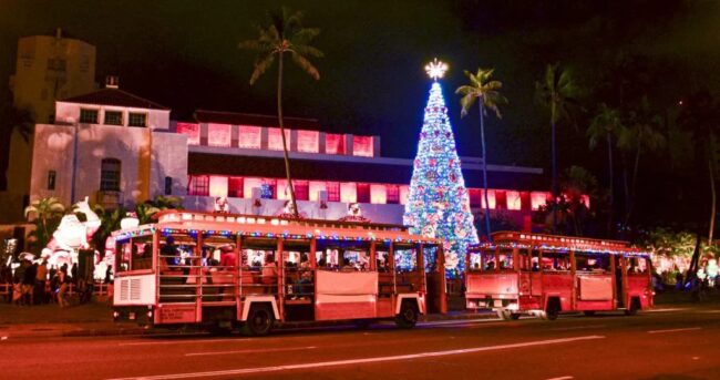 ホーリー ジョリー ワイキキ トロリーに乗って、ホリデーライトの輝きと華やかな雰囲気を満喫しましょう。