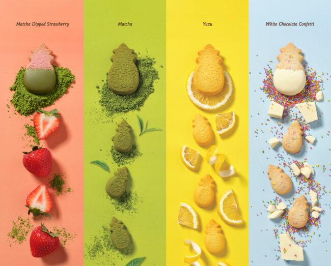 新作の「抹茶ディップ・ストロベリー」。バターの風味豊かなストロベリー・ショートブレッドを、抹茶を練り込んだクリーミーなホワイトチョコレートでディップし、フルーティーな甘さと緑茶ならではのほのかな苦味が絶妙に調和した一品です。このほか、抹茶、柚子、ホワイトチョコレート・コンフェッティといった季節限定フレーバーもラインアップに加わります。