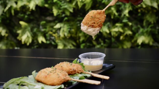 カリッと揚げた海老のすり身3個を自家製ココナッツ・パイナップル・マヨネーズで。トロピカルなアクセントが効いた一品です。